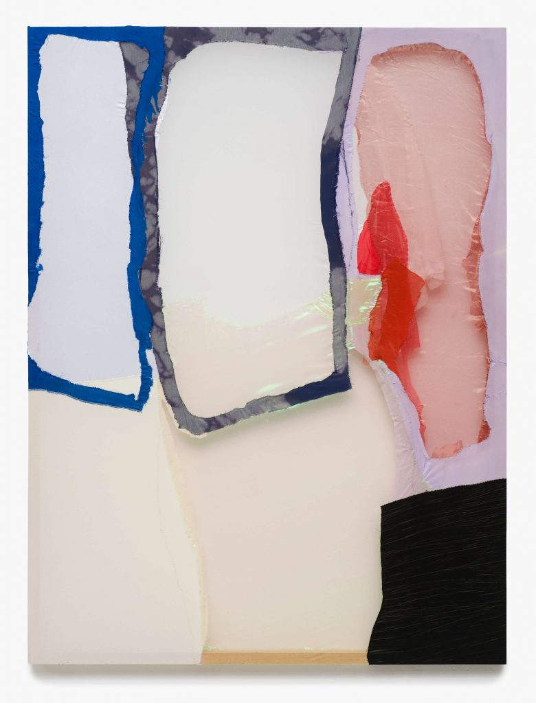 Tulle, silk, plastic net, gauze, satin, polyester, yarn on wooden stretch frame; 160 × 120 × 3,5 cm
