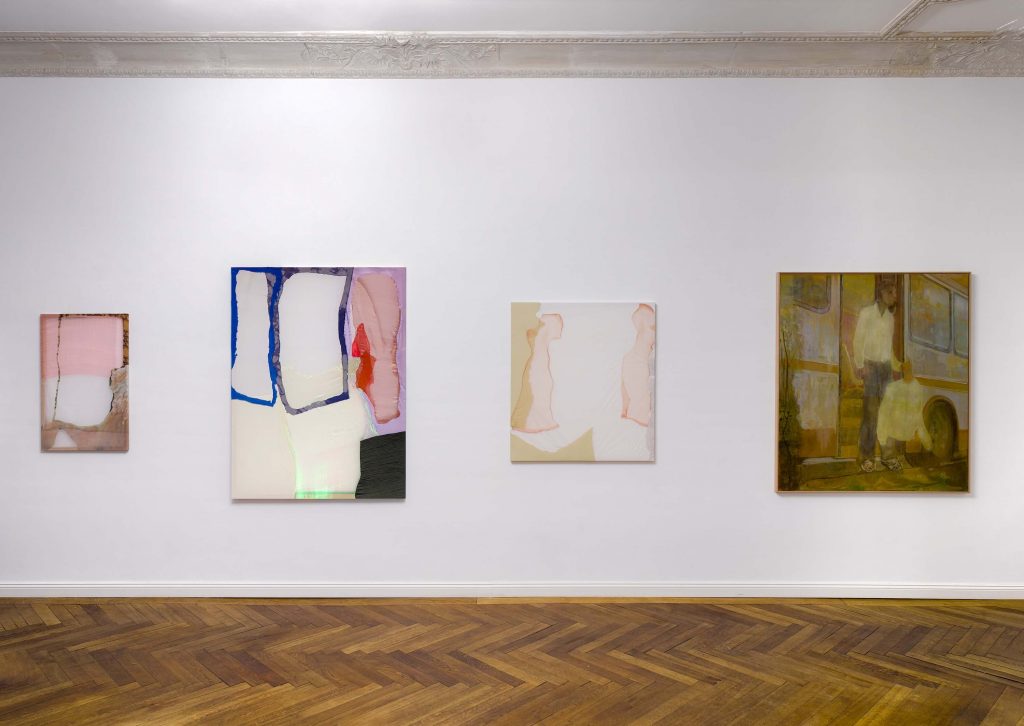 Silk, chiffon, velvet, satin, lining, polyester, yarn on wooden stretch frame; 160 × 120 cm (installation view: Drei, Cologne, 2020)
