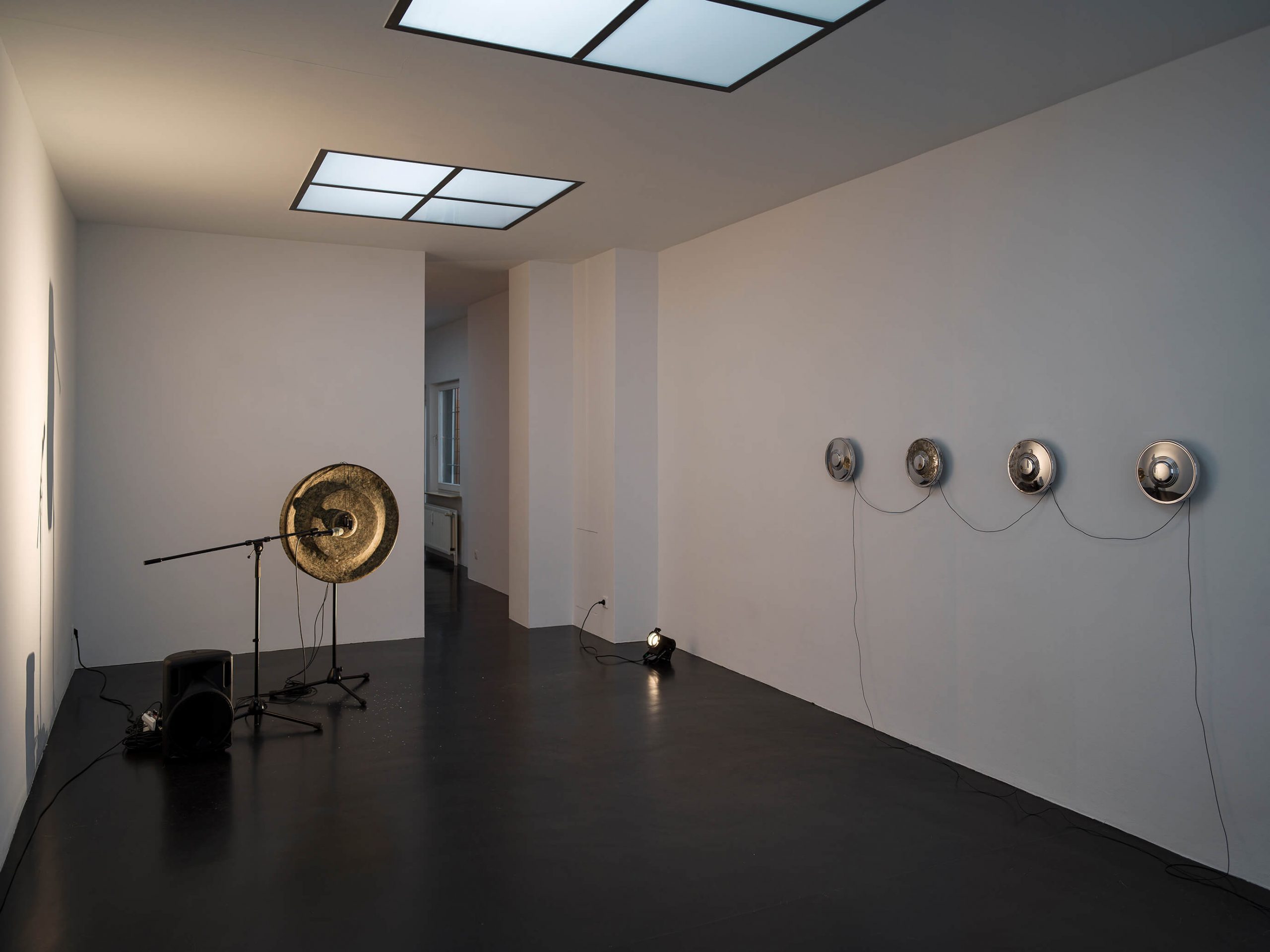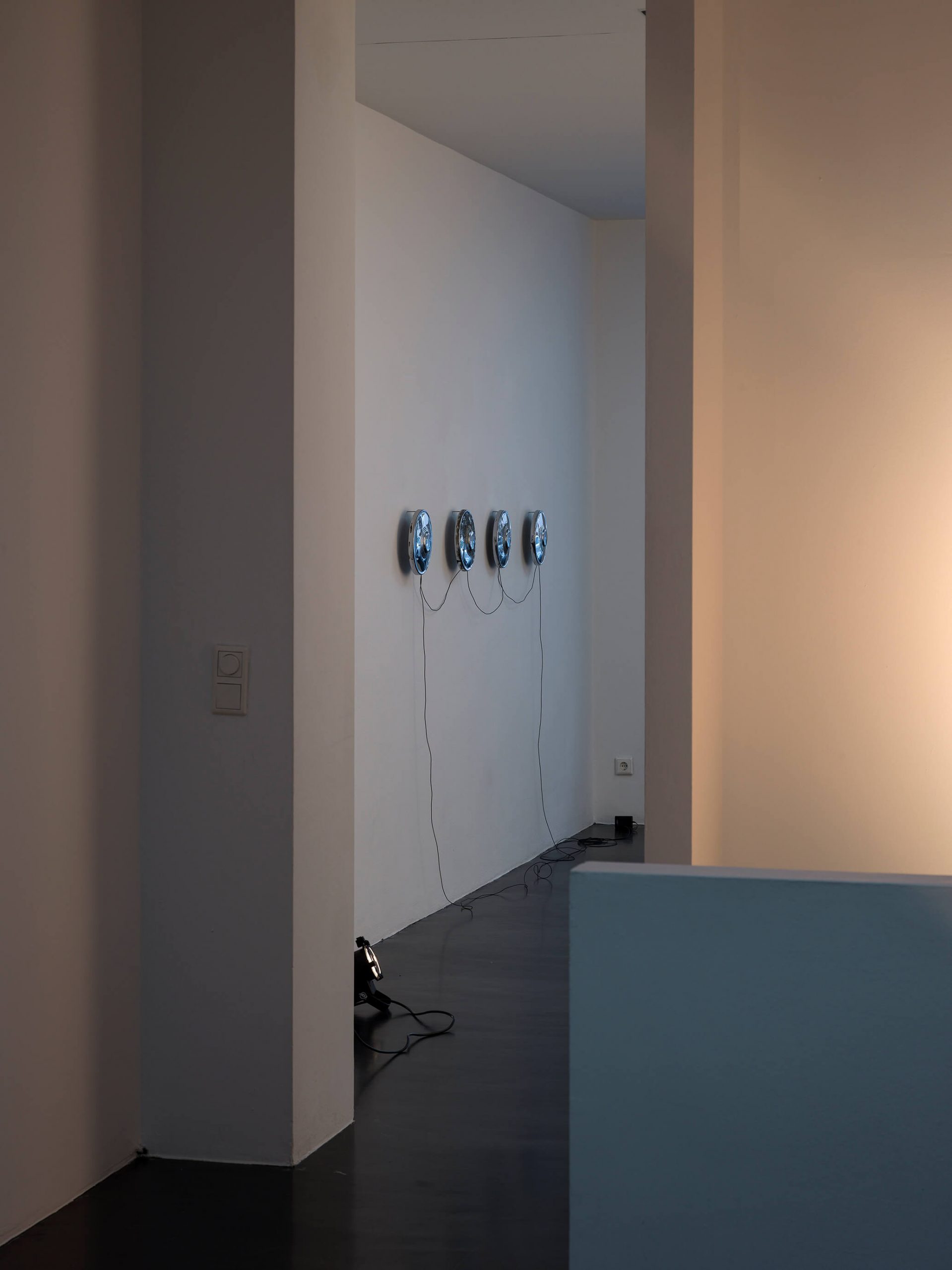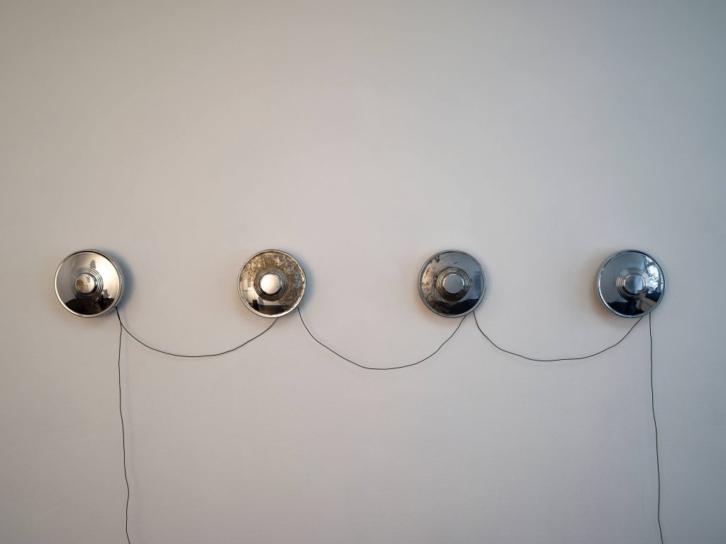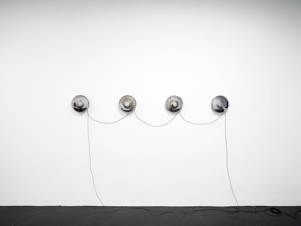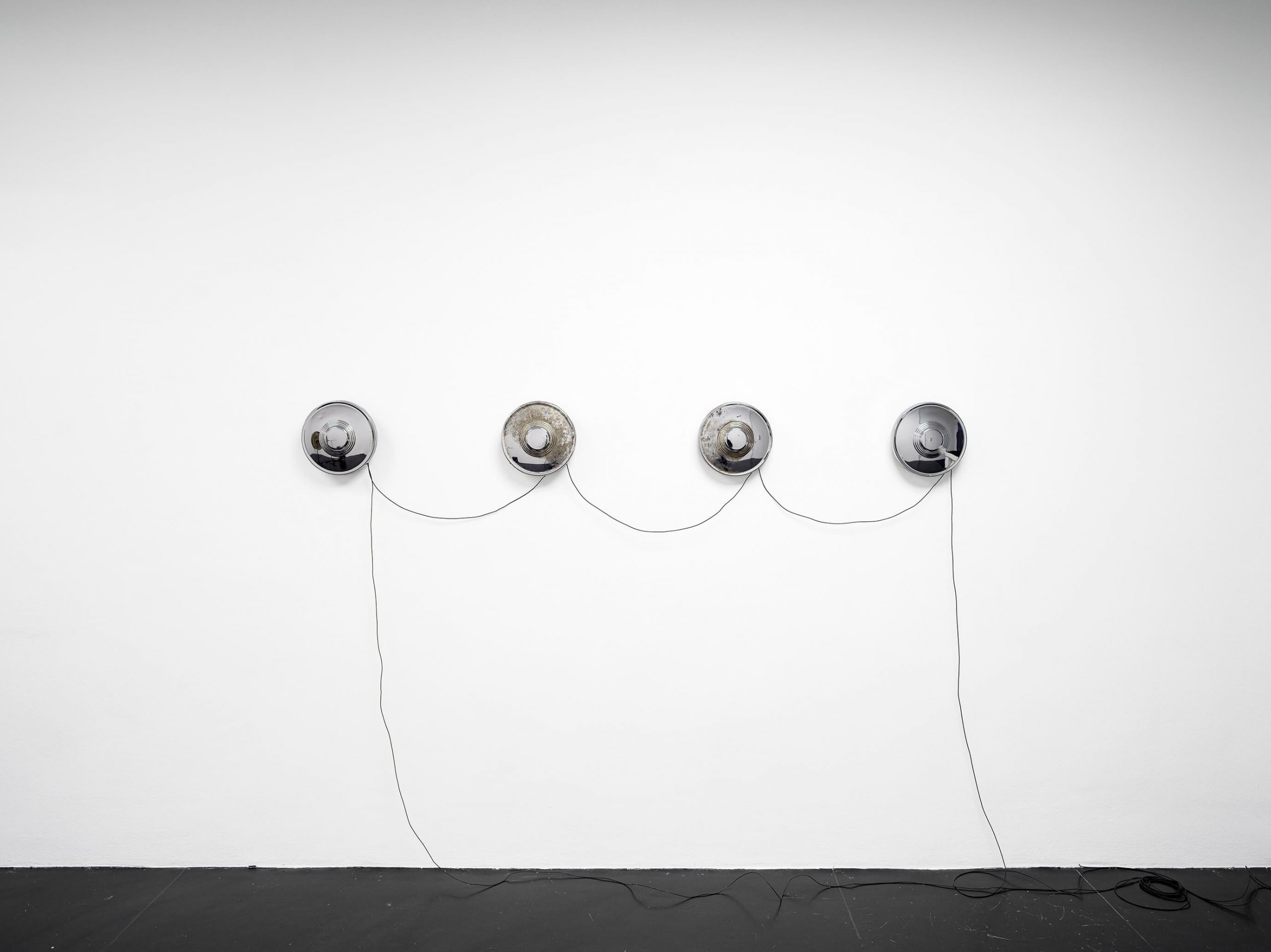 Four Trabant hubcaps, metal, cables, sextoys, motion detector; 23 × 200 × 8 cm / 9 × 78 3/4 × 3 1/8 in