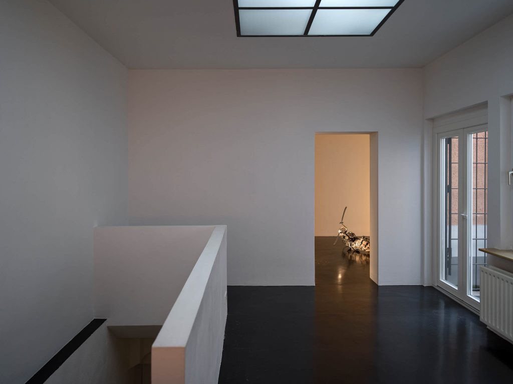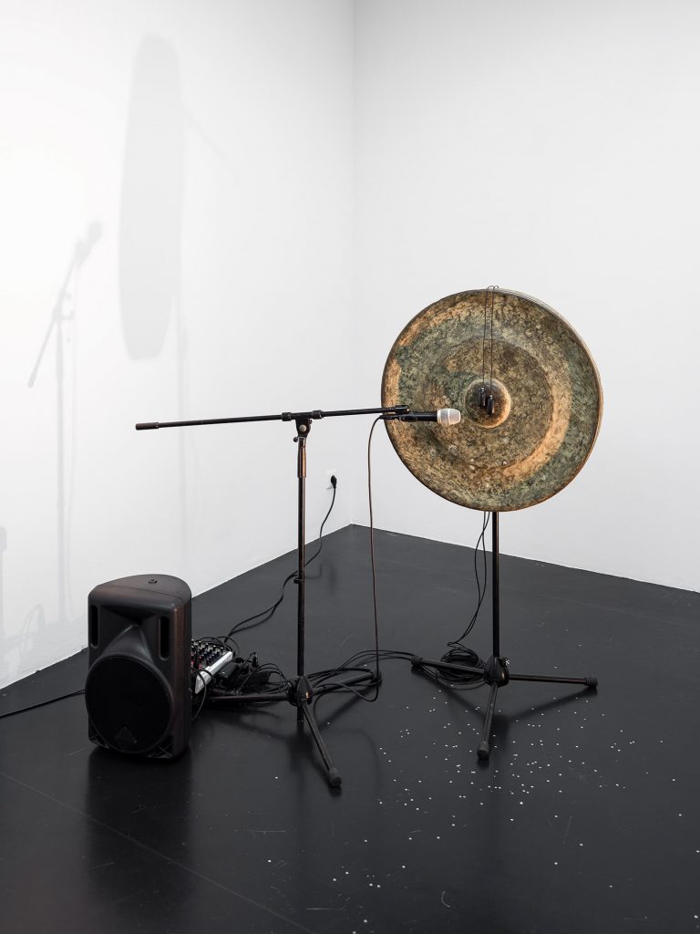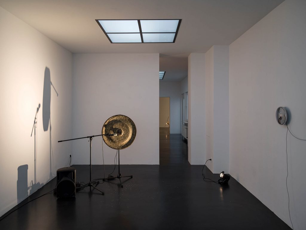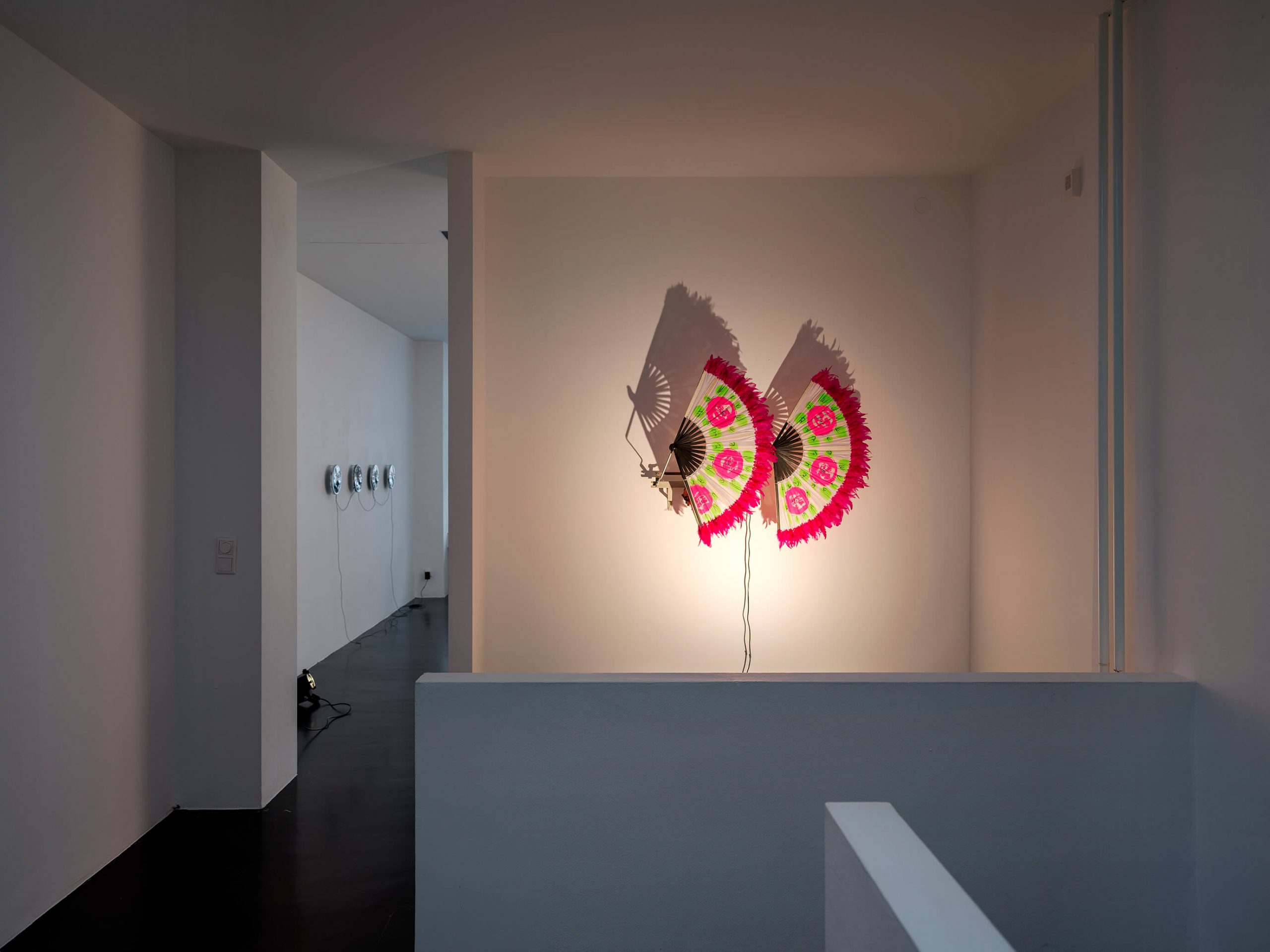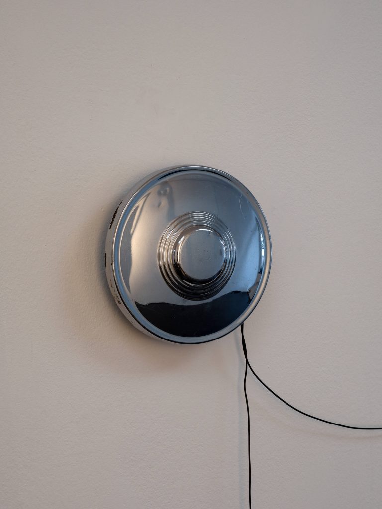 Four Trabant hubcaps, metal, cables, sextoys, motion detector; 23 × 200 × 8 cm / 9 × 78 3/4 × 3 1/8 in