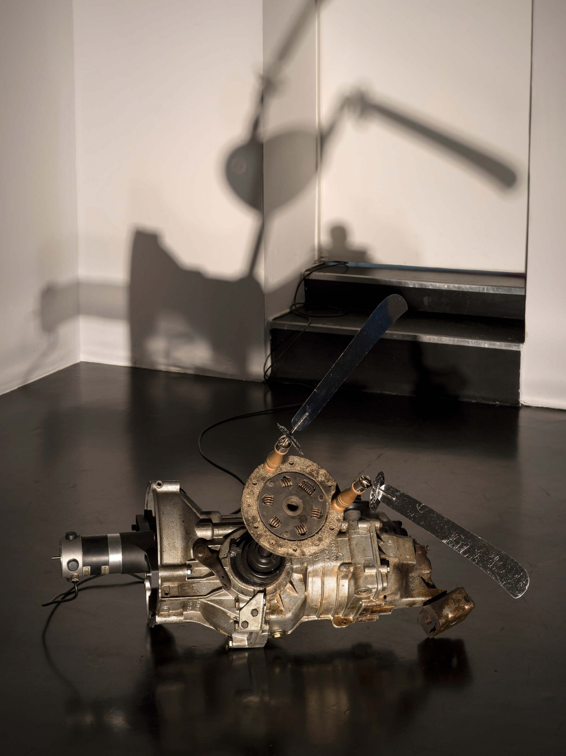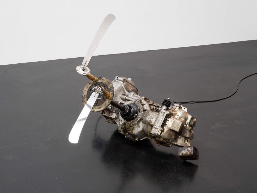 Spirit knives, Wartburg manual transmission, clutch disk, electric motor, cable; 50 × 80 × 100 cm / 19 5/8 × 31 1/2 × 39 3/8 in